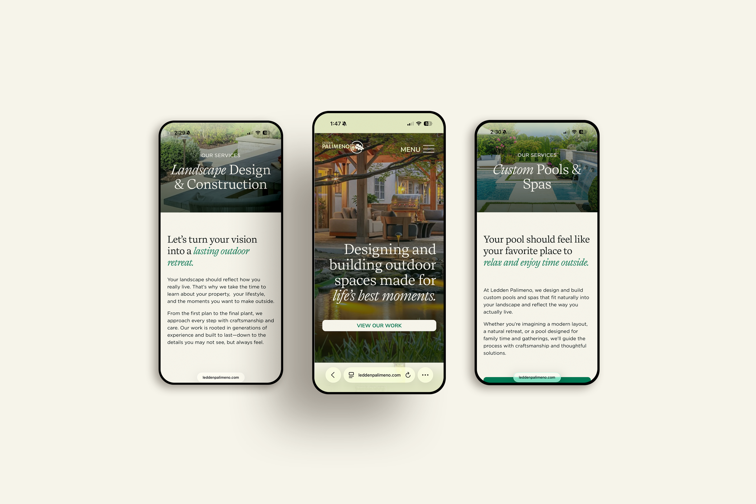 We began, as we always do, with strategy. Before any design decisions were made, we worked to define what Ledden Palimeno's brand truly stood for — the philosophy behind the craft, the experience clients actually have, and the positioning that would serve them best going forward. What emerged was a brand rooted in depth, legacy, and the belief that a great landscape is built for how people live.