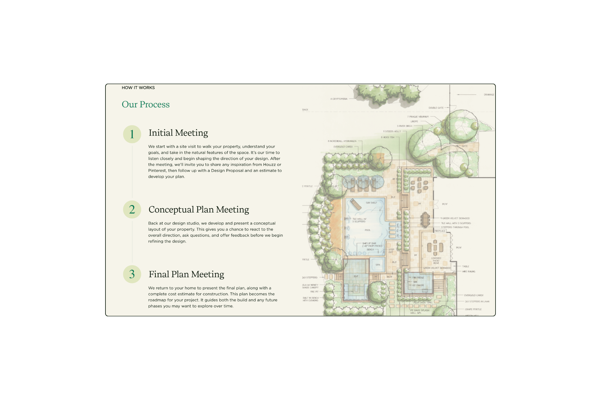 The previous digital presence undercut the level of work it was meant to represent — dated in structure, inconsistent in tone, and visually out of step with the high-end residential and commercial clients Ledden Palimeno attracts. Founder Joe Palimeno and his daughter and lead landscape architect Laura had built something exceptional. The brand and web experience needed to reflect it.